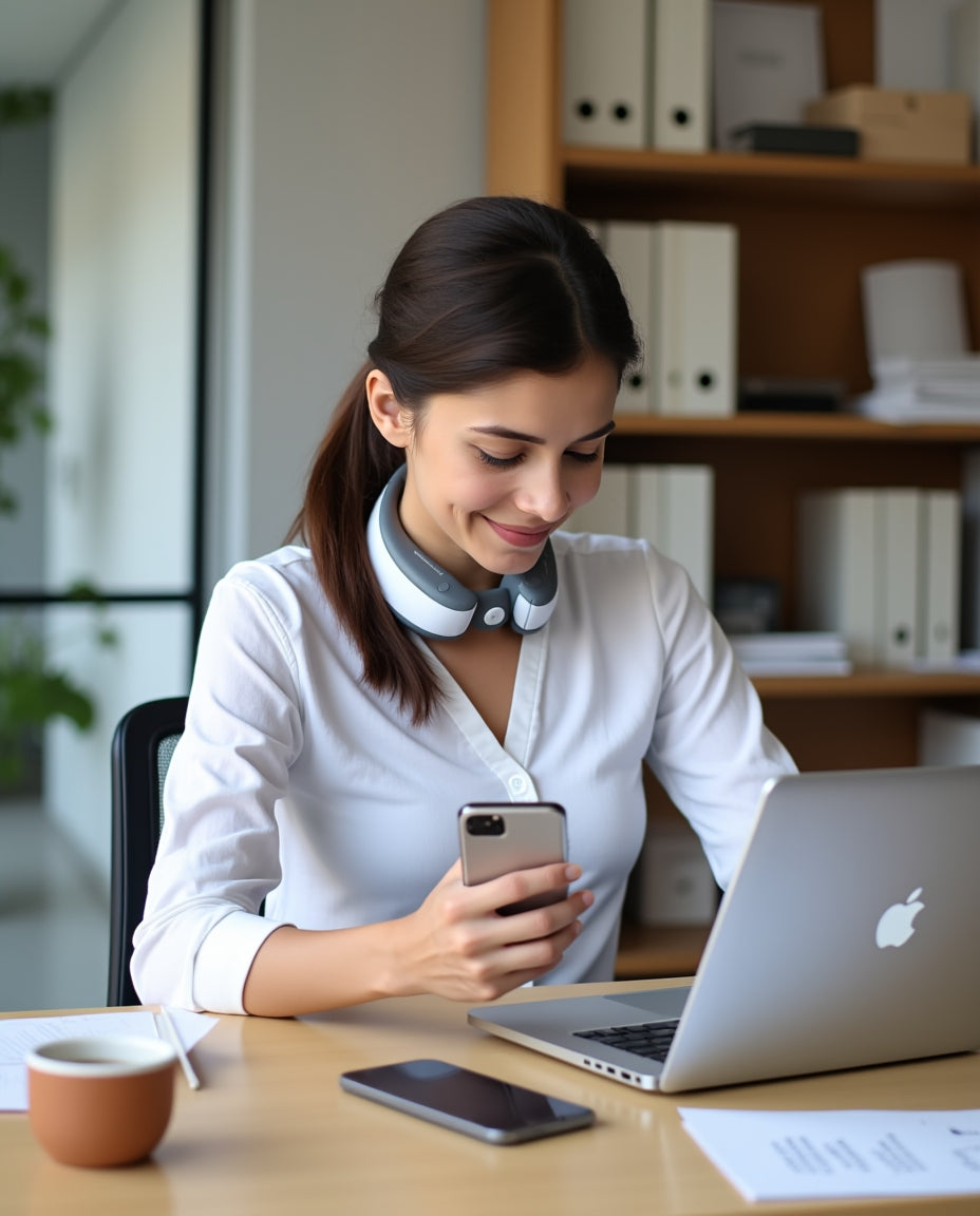 Paso muchas horas frente a la laptop y me ayuda a aliviar la tensión del cuello mientras sigo trabajando. Laura P – Diseñadora
